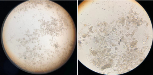 (鏡檢污泥絮體細(xì)碎,可見少量輪蟲及表殼蟲,鐘蟲等原生動物較少 )