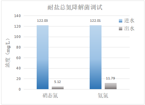 糧果廢水鹽度2%,30℃下經過我司耐鹽總氮降解菌的生物調試后,硝態氮的去除率超過95%、氨氮的去除率超過90%。